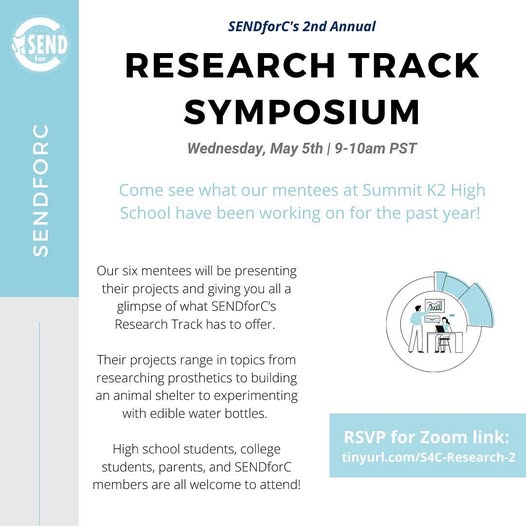EXCITING NEWS! 🥳 SENDforC’s Research Track will be holding a virtual symposium on Wednesday, May 5th, from 9-10am PST! Join us on Zoom to see what our mentees from Summit K2 High School have been working on the past year. All high school students, college students, and parents are encouraged to attend. Please show some support for these amazing students and their mentors! RSVP at tinyurl.com/S4C-Research-2 (fb)