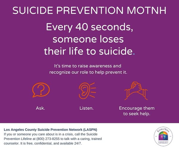 💙 As we wrap up September’s Suicide Prevention Month, EntreNous Community Empowerment reminds you that your mental health matters every day of the year. You are never alone—support is always within reach. If you or someone you love is in crisis, call the Suicide Prevention Lifeline at (800) 273-8255 to connect with a caring, trained counselor. It’s free, confidential, and available 24/7. 💙 #SuicidePrevention #YouAreNotAlone #MentalHealthMatters #EntreNousCares (fb)
