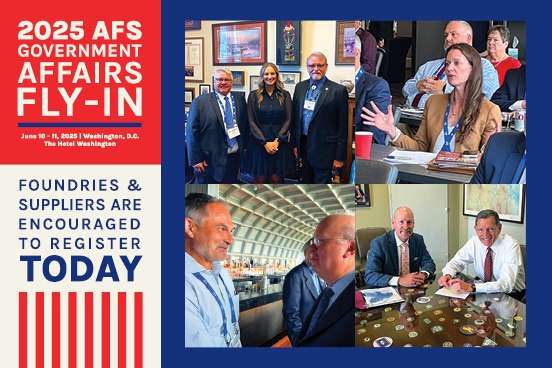 On June 10-11, dozens of metalcasters and suppliers will be in Washington D.C. for the annual AFS Government Affairs Fly-In. This week, AFS announced the five issues that will be the focus of advocacy efforts: - Restore Pro-Growth Tax Policy - Combat Trade Cheats - Energy Accessibility and Reliability - Rebalance Regulations to Strengthen Manufacturing - Modernize America’s Workforce Development System Looking to make your voice heard on these issues? Register for the event: https://www.afsinc.org/conferences/2025-government-affairs-fly (fb)