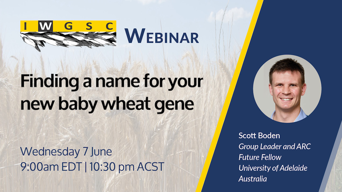 The next #IWGSC webinar is on Wednesday 7 June at 9:00am EDT (9:00am EDT, 3:00 pm CEST, 10:30 pm ACST), Scott Boden (University of Adelaide, Australia) will present "Finding a name for your new baby wheat gene", guiding us through the updated guidelines for naming newly discovered wheat genes. Secure your spot: https://attendee.gotowebinar.com/register/5761755820733132376 (fb)