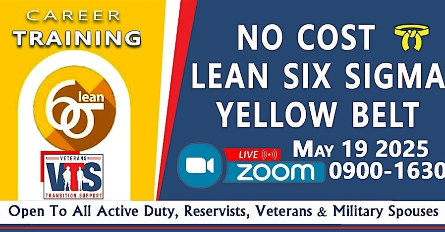 🎯 FREE Lean Six Sigma YELLOW BELT Certification for Veterans! 🇺🇸 Are you a Veteran, Active Duty Service Member, or Military Spouse looking to gain an edge in today’s job market? Earn your Lean Six Sigma YELLOW BELT in this live, online class — at absolutely no cost! 🔧 What you’ll gain: Industry-recognized YELLOW BELT Certification Real-world tools to solve workplace problems Eligibility for our advanced Green Belt training 🗓️ Date: Monday, May 19, 2025 🕘 Time: 9:00 AM – 4:30 PM (Pacific Time) 💻 Location: Live via Zoom – 100% FREE 🔗 Register now: https://www.eventbrite.com/e/no-cost-lean-six-sigma-yellow-belt-on-zoom-05192025-9-430pm-pst-registration-1333244332689?aff=oddtdtcreator Offered by Veterans Transition Support – helping our heroes go From Service to Success. #Veterans #LeanSixSigma #YellowBelt #MilitaryTransition #CareerTraining #FreeCertification (fb)