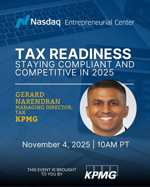 🧾 Taxes can make or break your next big move. With major reforms arriving in 2025, founders can’t afford to wait and see. Join KPMG U.S.’s Gerard Narendran and the Nasdaq Entrepreneurial Center for Tax Readiness: Staying Compliant and Competitive in 2025, a live session designed to help you anticipate, not react. You’ll walk away ready to make smarter decisions around equity, fundraising, and exits. 📅 November 4 · 10–11am PT | Online 🎟️ Register → https://www.eventbrite.com/e/tax-readiness-staying-compliant-and-competitive-in-2025-tickets-1835670362469?aff=FB #StartupFinance #TaxStrategy #Entrepreneur #NasdaqCenter (fb)