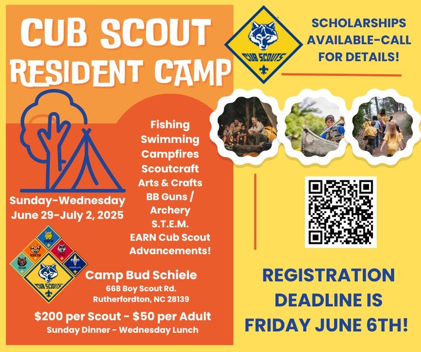 Don't miss this great opportunity to camp with your Cub Scout at the Cub Scout Resident Camp. Camp is open to ALL rising 1st-5th grade cub scouts. For additional information or to register, use the QR Code. (fb)