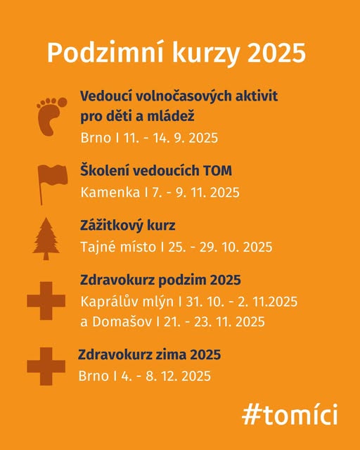 🍂 Podzimní vzdělávání 🍂 Podzim 2025 přinese spoustu možností, jak se posunout dál v roli vedoucího, instruktora, nebo zdravotníka. Rada vzdělávání Asociace TOM pro vás připravila hned několik kurzů, ze kterých si vybere každý: Pro vedoucí 🔸 Vedoucí volnočasových aktivit pro děti a mládež – Brno: 11. – 14. 9. 2025 👉 Novinka! Čtyřdenní kurz pedagogického minima pro volnočasové pracovníky. Zde je také možnost složit kvalifikační zkoušku. 🔸 Školení vedoucích TOM – Kamenka: 7. – 9. 11. 2025 👉 Základní školení pro začínající vedoucí oddílů. Pro instruktory, pro vedení programu a osobnostní rozvoj 🔸 Zážitkový kurz: 25. – 29. 10. 2025 👉 Kurz plný netradičních her a simulačních programů. Čeká vás vystoupení z komfortní zóny i nové poznatky o sobě. Kurz je určen pro zájemce starší 15 let. Pro zdravotníky 🔸 Zdravokurz podzim 2025: Kaprálův mlýn, 31. 10. – 2. 11. 2025 a Domašov 21.–23. 11. 2025 🔸 Zdravokurz zima 2025: Brno, 4. – 8. 12. 2025 👉 Kurzy určené pro budoucí táborové zdravotníky. Těšíme se na všechny, kteří chtějí načerpat inspiraci, nové dovednosti a chuť posouvat sebe i své oddíly dál! 🌟 (fb)