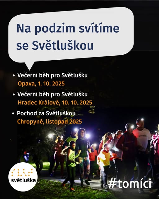 Víte, že tomíci kromě schůzek, výletů a táborů pořádají během roku i dobročinné akce? Na podzim chystají například pro Nadační fond Českého rozhlasu dokonce hned několik benefičních akcí, které podpoří lidi se zrakovým postižením. 🏃♂️ Ve středu 1. října se poběží Večerní Běh pro Světlušku Opava. Ten pořádá TOM Kadao Opava a minule se ho zúčastnilo téměř 600 běžců. 🏃♂️ V pátek 10. října se Večerní běh pro Světlušku poběží úplně poprvé v Hradci Králové. Pořádá ho RDM KHK - Rada dětí a mládeže Královéhradeckého kraje, TOM Hraboši a další. 🏮 V listopadu připravuje Pochod za Světluškou TOM Chropyně - Kamínek. 👀 A vlastně ještě něco! Už za 14 dní pořádá přímo Světluška - Nadační fond Českého rozhlasu noční běh v Liberci. Bude ve čtvrtek 18. září a v zázemí potkáte tomíky z TOM Myšáci. Držíme palce, ať se všechny akce vydaří! A děkujeme vám, kteří pomáháte! 🙏 (fb)