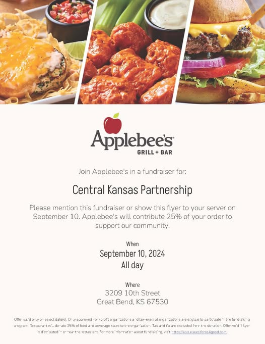 🍽️ Looking for an easy decision for lunch or supper? 🍽️ Join us at Applebee’s today, September 10th, 2024, and support the Central Kansas Partnership while enjoying a great meal! 🧡 📍 Where: Applebee's, 3209 10th Street, Great Bend, KS 67530 🕓 When: All day, September 10th Just mention this fundraiser or show the flyer to your server, and 25% of your order will support our community! Skip the meal planning and make a difference while you dine! #EasyMeal #SupportLocal #CommunityFirst #Fundraiser #Applebees #CentralKansasPartnership (fb)