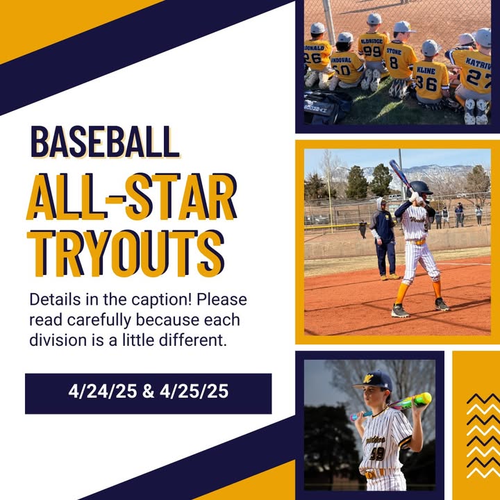 Baseball All-Star Tryouts are this week! Please read all details, locations and some details differ per division. 8U, 9U, and 10U Divisions Dates: Thursday, April 24th and Friday, April 25th (players in these divisions must attend both days) Time: 6:00 PM - 8:30 PM Location: Settlers Park * 8U - Field 3 * 9U - Field 4 * 10U - Field 5 11U Division Dates: Thursday, April 24th and Friday, April 25th (players must attend both days) Time: 6:00 PM - 8:30 PM Location: Fuller Park, Field 2 13U Division Date: Thursday, April 24th (one day only) Time: 6:00 PM - 8:30 PM Location: Settlers Park, Field 1 (fb)