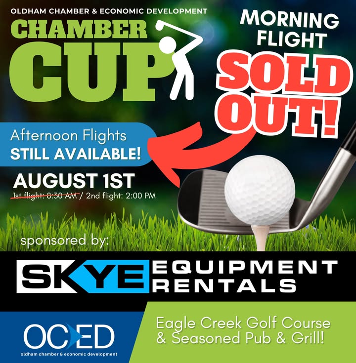🎉 SOLD OUT! 🎉 Our MORNING FLIGHT for the Chamber Cup is officially full — thank you to everyone who signed up! ⛳️ Still want in on the action? We’ve got a few SPOTS LEFT in the AFTERNOON FLIGHT, but they’re going fast! 📅 Don’t wait — grab your team’s spot now and join us for a great day on the course! 🏌️♂️🏌️♀️ Thanks to our sponsor, Skye Equipment Rentals! ⬇ Click here to register ⬇ https://members.oldhamcountychamber.com/events/details/chamber-cup-golf-scramble-2025-5593?calendarMonth=2025-08-01 (fb)