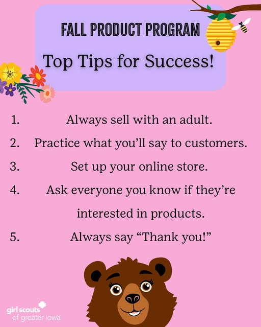 Here are some Fall Product Tips for your Tuesday! 😉 As seen in the Fall Product Kickoff video, GSGI provided Top Tips for Success for Girl Scouts to keep in mind this season: 1. 👭 Always sell with an adult. Selling with and adult ensures safety! 2. 💭 Practice what you'll say to customers. "Hi there! Would you like to support our Girl Scout troop? We have nuts, chocolates, and more!" 3. 💻 Set up your online store. Previous Shout Out! email newsletters walk you through the M2 system. Subscribe to the weekly newsletter if you haven't already: https://www.gsgibridge.org/shout-outs 4. 🗣 Ask everyone you know if they're interested in products. You can ask family, neighbors, teachers, coaches - you name it! 5. 🤗 Always say "Thank you!" Thank you, thank you, from the bottom of my bear-y heart! 🐻 For additional Fall Product information, visit The Bridge: https://www.gsgibridge.org/fallprogram 🍫💚 #TipTuesday (fb)