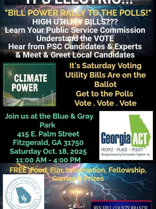 ⚡️💡 It’s Electric — Bill Power Rally to the Polls! 💡⚡️ Are your utility bills too high? Learn how your Public Service Commission impacts your power costs and your vote! Join Georgia ACT, Climate Power, Civic Pioneers, and the Ben Hill County NAACP for an energizing day of learning, fellowship, and action. 📍 Blue & Gray Park 415 E. Palm Street, Fitzgerald, GA 31750 📅 Saturday, October 18, 2025 🕚 11:00 AM – 4:00 PM 🎤 Hear from PSC candidates and experts 🤝 Meet & greet local leaders 🗳️ It’s Saturday voting — Utility bills are on the ballot! 🍔 Enjoy free food, fun, games, and prizes while making your voice count. Get to the polls. Vote. Vote. Vote. Together, we’re powering people, place, and policy across Georgia! 💙💚 #GeorgiaACT #VoteGeorgia #ItsElectric #ClimatePower #CivicPioneers #BenHillNAACP #AffordableEnergy #CommunityPower #GetOutTheVote #PublicServiceCommission #PeoplePlacePolicy (fb)