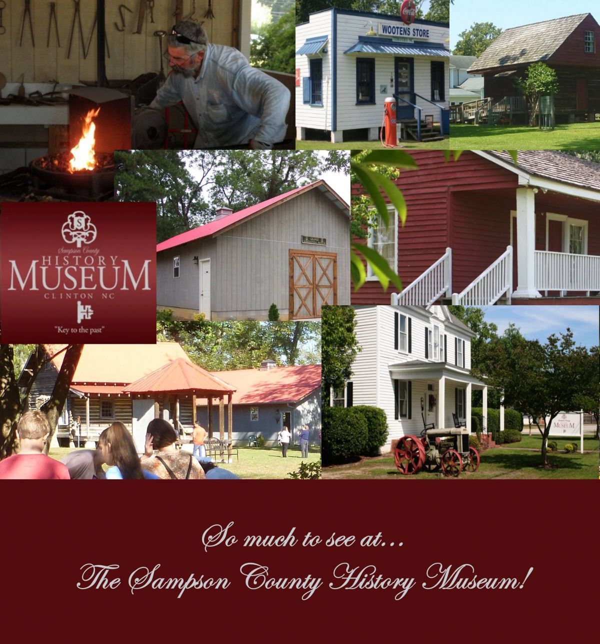 The SCHM is an 11 building complex which houses artifacts pertaining to rural life in North Carolina, especially Sampson County. Admission is free. THE SAMPSON COUNTY MUSEUM OF HISTORY IS INTENDED FOR PROMOTION AND UNDERSTANDING OF HISTORICAL AND MATERIAL CULTURE OF SAMPSON COUNTY AND ITS UNIQUE HERITAGE. THROUGH COLLECTIONS AND HISTORICAL INTERPRETATION, THIS MUSEUM PROMISES TO ENCOURAGE VISITORS AND CITIZENS TO EXPLORE AND RELATE ON A PERSONAL LEVEL PAGES FROM THE PAST; TO REFLECT AND PAUSE AS THEY SEARCH THROUGH THEIR OWN LIVES AND THEIR PLACE IN HISTORY; AND TO PRESEVE STATE, REGION AND ESPECIALLY LOCAL HISTORY FOR ALL THE GENERATIONS TO COME. WE WILL COLLECT, PRESERVE AND MAINTAIN IN READILY ACCESIBLE CONDITION EVERY AVAILABLE FORM OF MATERIAL AND ARTIFACT DEEMED WORHTY, ESPECIALLY THOSE PERTAINING TO THE HISTORY OF SAMPSON COUNTY AND ITS CITIZENS; TO MAINTAIN AND PROTECT FACILITIES, WHICH WILL ENABLE STUDENTS AND OTHER RESEARCHERS TO UNDERSTAND AND USE THE MUSEUM FOR THEIR INDIVIDUAL ENRICHMENT. FURTHER, NO ONE WILL BE DENIED THE OPPORTUNITY TO ENJOY AND LEARN FROM THE MATERIALS AND ARTIFACTS OF HISTORICAL SIGNIFICANCE, WHIC