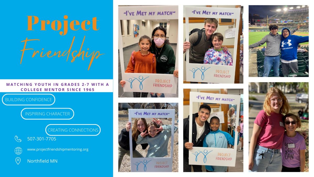 Project Friendship is a mentoring program that matches Northfield children with students from Carleto Project Friendship supports mentoring relationships between Northfield youth and college students that provide intentional activities to create opportunities for social and emotional learning, specifically improving confidence, enriching connections and developing character.