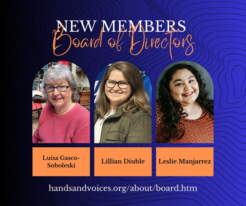 Welcome to NEW! members of the Hands & Voices Board of Directors - Luisa Gasco-Soboleski, Lillian Diuble and Leslie Manjarrez. https://handsandvoices.org/about/board.htm Luisa Gasco-Soboleski is a third-generation deaf and a mom to two deaf adults and has three deaf grandchildren and a CODA grandson. Luisa lives in Southington, CT with her husband, Richard, ASD graduate and retired Assistant Supervisor in the Aircraft Inspection Department for Connecticut’s Pratt and Whitney. She is one of the founding members of Connecticut Hands & Voices. After her retirement as an Administrator at the American School for the Deaf, she became an advocate and parent representative in many different organizations such as Connecticut Association of the Deaf (as its President), EHDI and DeafBlind. Collaborating among organizations serving deaf, deafblind, and hard of hearing individuals has been her biggest goal. She has a passion advocating for families and members of the deaf, deafblind, and hard of hearing community throughout the state of Connecticut promoting legislative support for providing better services for them. Lillian Diuble is Deaf/hard of hearing and has a vision loss, causing her to be diagnosed with PRPS1. Lillian is the Accessibility Coordinator and a Deaf/Hard of Hearing (DHH) Guide for Michigan Hands & Voices. She holds a degree in nonprofit administration and holds a credential as a Certified Nonprofit Professional (CNP). In addition to her work with Michigan Hands & Voices, she works with other nonprofit organizations. Including Diuble Family Vision, Foundation Fighting Blindness, Sonic Alert, and MI Prevention, just to name a few. Lillian is passionate about advocacy and accessibility for those that are Deaf or hard of hearing, and those with additional disabilities. She longs to make the world a more accessible place for all. Leslie Manjarrez is a born and raised California girl: Born in San Diego, raised in the Imperial Valley, now living in San Francisco. Leslie’s pronouns are she/her. Leslie is trilingual; English, Spanish, and American Sign Language. She possesses over 12 years of experience in Deaf education which spans infancy to adult within a variety of environments from in-person, in-home, in-school classrooms, and virtual online instruction. She currently works as a Teacher of the Deaf, Early Interventionist, Child Life Specialist, Interpreter and Co-Director of a Camp for Deaf Children. Leslie believes that children are as diverse as the cities we each live in and strives to continue to learn skills to best support them all with a lens of equity and justice within clinical and educational settings. (fb)
