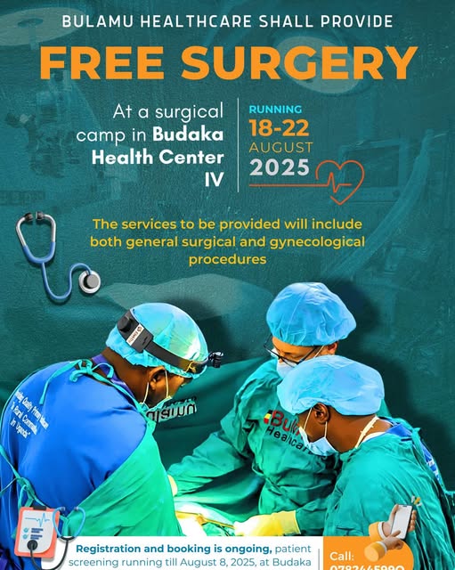 📢 Big News from Bulamu Healthcare! From August 18–22, 2025, patients at Budaka Health Center IV will receive no-cost general and gynecological surgical procedures as part of this special medical initiative. 🕗 Screening and registration are ongoing through August 8, from 8:00 AM–4:30 PM (Ugandan Time). 📞 To register or learn more, call 0782445990 Let’s continue building a healthier future—together.🇺🇬 #BulamuHealthcare #FreeSurgery #Budaka #MedicalCamp #SavingLives #HealthcareForAll (fb)