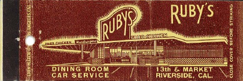Do you remember Ruby's on 13th & Market? How about their delicious hamburgers and famous fried chicken? The Museum of Riverside just acquired this vintage Ruby's matchbook! This object will be featured in a new exhibition, Fast 'n' Fresh: The Inland Empire's Influence on the Fast-Food Industry, 1940 - 1970. The exhibition is set to open in 2027 along with the grand reopening of the main museum site in downtown Riverside. If you have objects like trays, cups, uniforms, kitchen equipment, menus, or name tags from local drive-ins during the 1940s - 1970s, the Museum may be interested in borrowing them for the exhibition. If you have any keepsakes, email Jennifer Dickerson, Curatorial Services Mgr, at jdickerson@riversideca.gov to let us know about any objects you may be willing to lend. (fb)