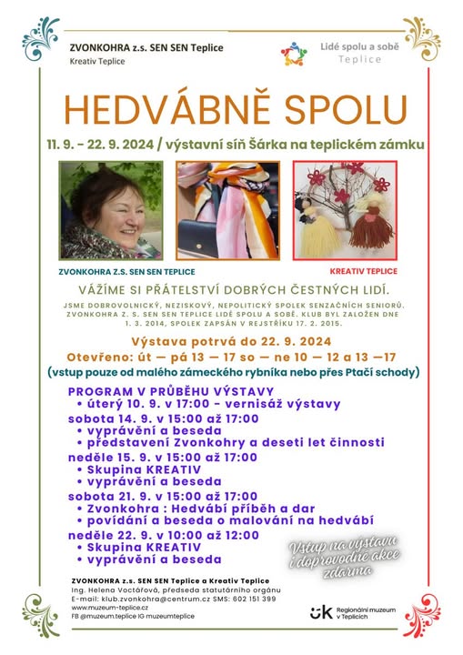 Již zítra 10. září od 17 hodin Vás zveme na vernisáž výstavy Hedvábně spolu do výstavní síně Šárka nad Ptačími schody. Více o doprovodném programu se dozvíte na webové stránce: https://zamek-teplice.cz/cz/aktuality/vernisaz-vystavy-hedvabne-spolu (fb)