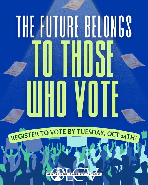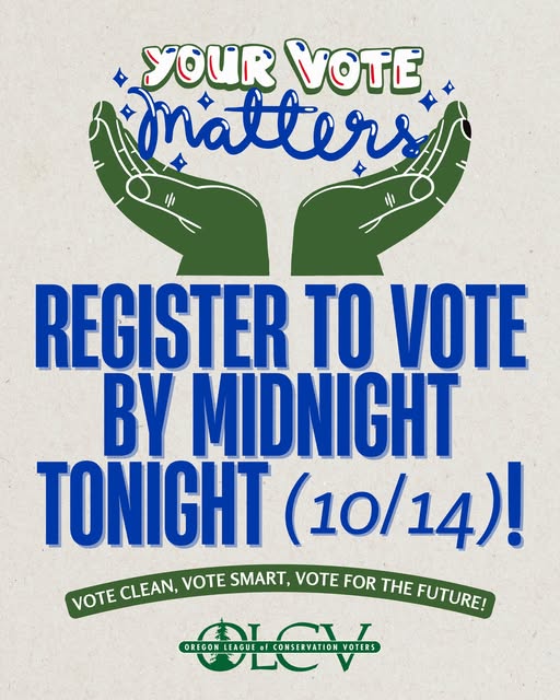 Today (Tuesday, October 14th) is the last day you can register to vote or update your registration, so make sure you do so by midnight tonight! It’s more important than ever for us to continue showing up and standing up for what’s right during this second Trump Administration. Exercising your right to vote whenever possible, and to vote for climate action, is a perfect way to do just that! But you can’t do it without updating your voter registration first. Register to vote or check your registration here: https://sos.oregon.gov/voting-elections/Pages/default.aspx (fb)