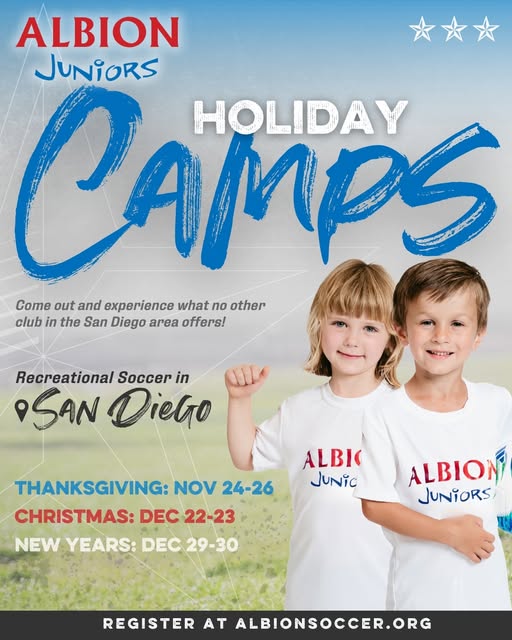 ALBION Juniors HOLIDAY CAMPS are HERE!! ⚽ Come out and experience what no other club in the San Diego area offers! Join us for fun, high-energy Recreational Soccer Camps this holiday season — perfect for young players ready to learn, play, and grow the ALBION way. 📍 Location: Robb Field, San Diego 🦃 Thanksgiving Camp: Nov 24–26 🎄 Christmas Camp: Dec 22–23 ✨ New Year’s Camp: Dec 29–30 Don’t miss out on an unforgettable soccer experience this holiday season! 👉 Register now from the link in bio #ALBIONJuniors #ALBIONSC #HolidayCamps #SanDiegoSoccer #ALBIONFamily #SoccerFun (fb)