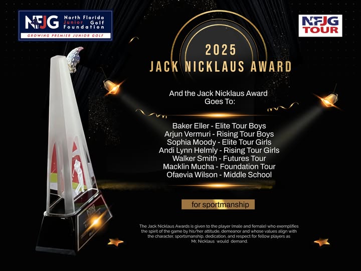 It is always an honor to present this award to players of the NFJGTOUR for their outstanding sportsmanship as Mr. Jack Nicklaus would demand. This award is nominated by and voted on by THE PLAYERS. Thanks for representing in such fine fashion. Annual Awards Banquet - TPC Sawgrass, Wednesday, August 20, 2025. (fb)