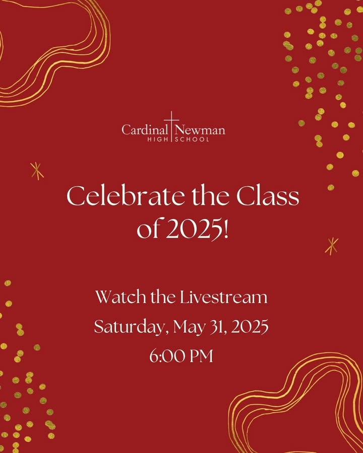 Celebrate the Class of 2025! For those unable to attend in person, we invite you to join us virtually in celebrating the Class of 2025. The Commencement Ceremony will be livestreamed beginning at 6:00 PM on Saturday, May 31. Visit cardinalnewman.org and click on the link. (fb)