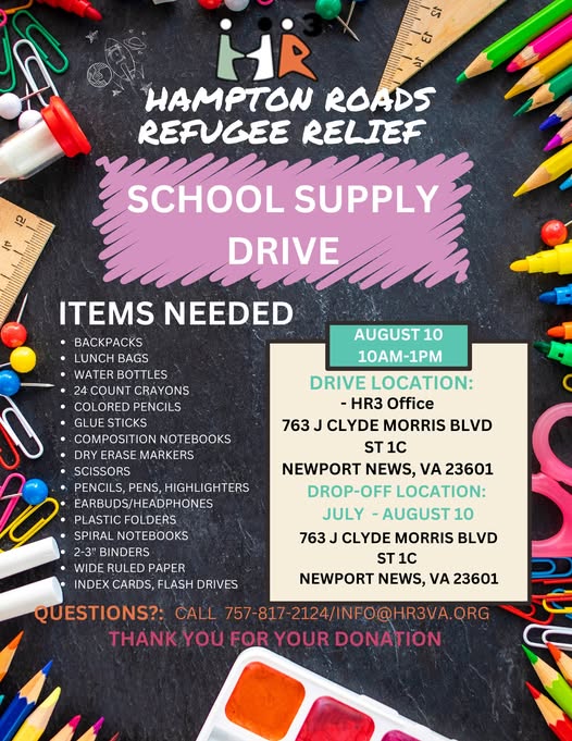 🎒✏️ HR3’s School Supply Drive is HERE! 📚🖍️ Help us set students up for success by donating school supplies now through August 10! 📍 Drop-Off Location: HR3 Office 763 J Clyde Morris Blvd, St 1C Newport News, VA 23601 📅 Final Drive Day: August 10 | ⏰ 10AM–1PM 🧡 Items Needed: Backpacks, crayons, notebooks, water bottles, headphones & more (see full list in flyer)! 📞 Questions? Call 757-817-2124 or email info@hr3va.org 🙏 Thank you for helping students start the school year strong! #HR3 #BackToSchool #SchoolSupplyDrive #GiveBack #CommunitySupport #NewportNewsVA (fb)