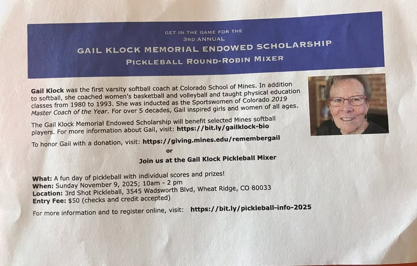 Join us Nov 9 for our Pickleball Mixer benefitting the Gail Klock (our former coach) Scholarship at Mines! (fb)
