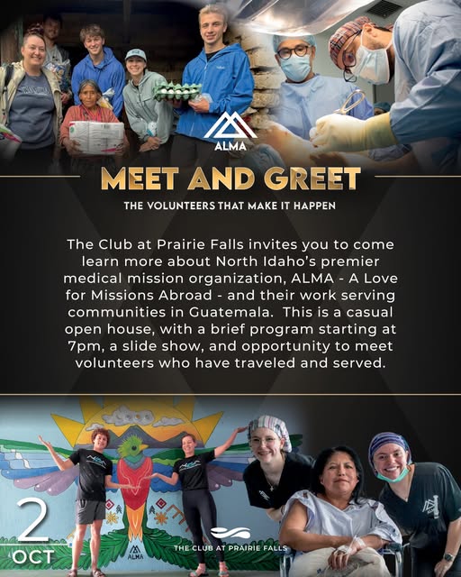 ✨ It’s today! ✨ Join us tonight at The Club at Prairie Falls for ALMA’s Meet & Greet. 💙 👉 Casual open house 👉 Program starts at 7PM 👉 Stories & slideshow from our Guatemala missions Don’t miss the chance to connect with the volunteers who make it all happen! 🩺✈️ 📝 FREE RSVP: https://go.theclubatprairiefalls.com/MeetGreetALMA-RSVP #ALoveForMissionsAbroad (fb)