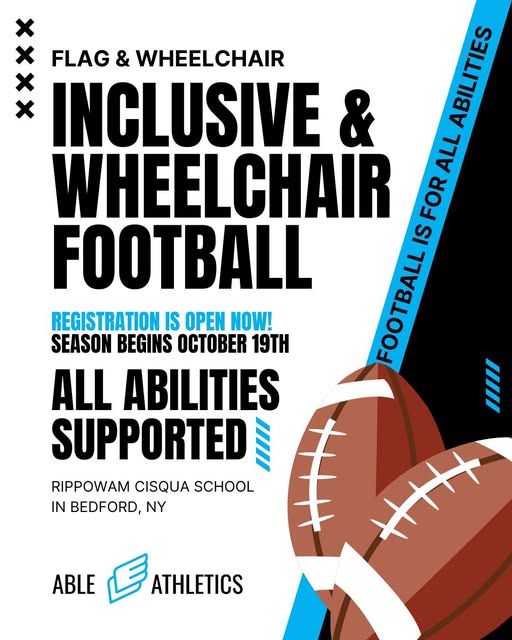 🏈 REGISTRATION IS NOW OPEN! 🏈 Able Athletics is excited to announce that signups are now open for both our Wheelchair Football and our Inclusive Flag Football programs! Designed for athletes of all abilities, these programs focus on: 💙 Teamwork 💙 Skill building 💙 Fun and supportive environments Register today - all athletes are encouraged to play at their own pace with the guidance of trained volunteers, coaches, and therapists. 🗓️ Mark your calendars - football starts October 19th! 👉 Visit able athletics.org to sign up now! #ableathletics #morethananathlete #morethanagame #everyoneisable #inclusivesports #flagfootball #wheelchairfootball #nonprofit #adaptivesports #inclusivesports (fb)