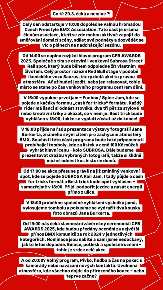 Finální hlasování je ukončeno, teď už nám nezbývá nic jiného než si 29.3. užít CFB Awards v @gizmaniacz Czechparku s bohatým doprovodným programem jak pro jezdce tak pro diváky. 🙌🏼 Plný den ježdění jak uvnitř tak snad i venku. S pegama nebo bez, zabaví se všichni. 🤗 Pro doprovod, diváky, fanoušky máme připravenou bohatou tombolu kde je možnost vyhrát kompletní @subrosabrand BMX od hlavního partnera akce @tbbbike 😍 Dražba fotek od @burysss aby jsi si mohl zkrášlit obývák a zakončíme to slavnostním vyhlášením všech kategorií 🏆 a volnou zábavou 🍻 Těšíme se, vidíme se 🤟🏽 #bmx #cfbawards (fb)