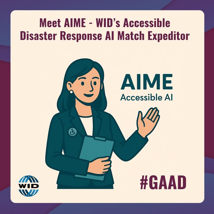 GAAD is a great time to meet AIME! WID’s accessible disaster response AI Match Expeditor. AIME uses generative AI technology to make disaster resources that were previously out of reach for the disability community accessible and available. AIME demonstrates that accessibility is not just a good idea - it is an achievable imperative. #accessibletechnology #disabilityinclusivedisaster #GAAD2025 (fb)