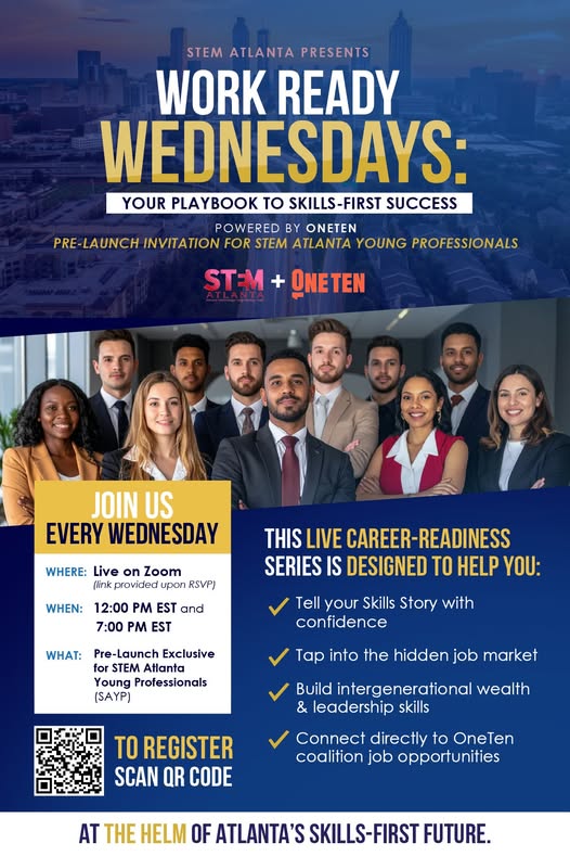 STEM Atlanta Presents: Work-Ready Wednesdays - STEM Atlanta’s skills-first career readiness series powered by OneTen. Start Date: Wednesday, September 10th at Noon or 7:00pm. Register today and spread the word. We are thrilled to announce the launch of Work Ready Wednesdays — STEM Atlanta’s skills-first career readiness series powered by OneTen. Every Wednesday, we’re helping Atlanta talent: ✅ Tell their skills story with confidence ✅ Tap into the hidden job market ✅ Build intergenerational wealth + leadership skills ✅ Connect directly to OneTen coalition job opportunities This isn’t just another career webinar — it’s your chance to gain the tools, connections, and confidence to step into the opportunities you deserve. Join us. Build your future. Be part of Atlanta’s next big workforce wave. Registration Required: - Noon Session: http://bit.ly/4mhvv60 - 7:00pm Session: http://bit.ly/4pbTsxY #STEMAtlanta #WorkReadyWednesday #OneTen #SkillsFirst #FutureOfWork #Atlanta @followers (fb)