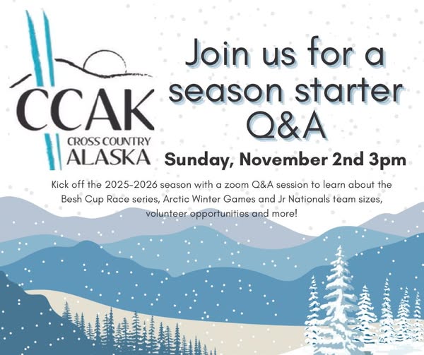 Cross Country Alaska Home About CCAK Calendar Besh Cup Register Here. Points Rankings Tuesday Night Ski Races JN 2025 Information Help Contact U16 REG Camps Alaska Trails Report More Thank you to our supporters Cross Country Alaska Mission To create and support a cross country skiing culture and environment that allows Alaska cross country ski racers to succeed at regional national and international competitions. Mailing Address Cross Country Alaska PO Box 241154 Anchorage AK 99524 EIN 920174320 Contact Email Thomas O39Harra with questions infocrosscountryalaska. org or ccak.