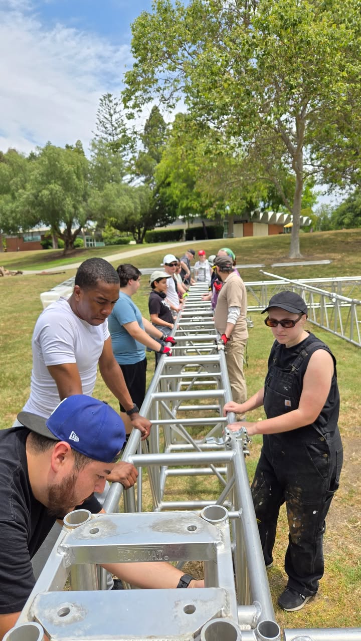 The truss build is officially underway in Kingsmen Park! Thanks to all of our hard-working interns and apprentices who make this job possible! #KingsmenShakespeare #TwelfthNight #Shakespeare #ThousandOaks #ConejoValley (Music by Doug LeBow) (fb)