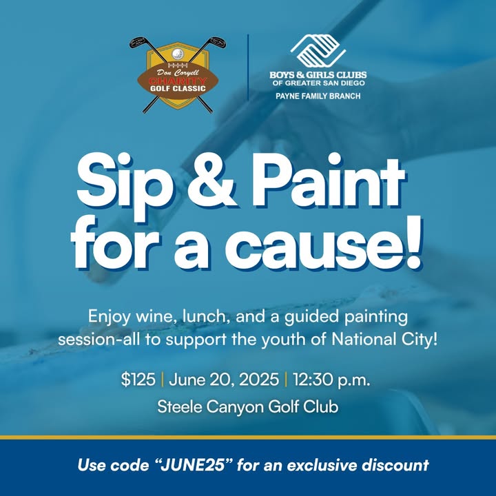 Looking for a fun and meaningful way to spend your Friday? Join us on Friday, June 20th at the beautiful Steele Canyon Golf Club for a relaxing Sip & Paint experience—part of the 22nd Annual Don Coryell Charity Golf Classic! 🍷🎨 Whether you're an experienced artist or just looking for a fun way to spend the day, this event is the perfect blend of creativity and community. Enjoy: -A step-by-step painting session led by a friendly local artist -A delicious lunch and refreshing beverages -A peaceful, scenic spot to unwind—no golf experience needed! Best of all, every brushstroke supports the youth of National City through the Boys & Girls Clubs of Greater San Diego—helping provide safe spaces, enriching programs, and brighter futures. Space is limited—reserve your canvas today: https://secure.qgiv.com/for/doncoryell2025/event/doncoryellcharitygolfclassic2025/ (fb)