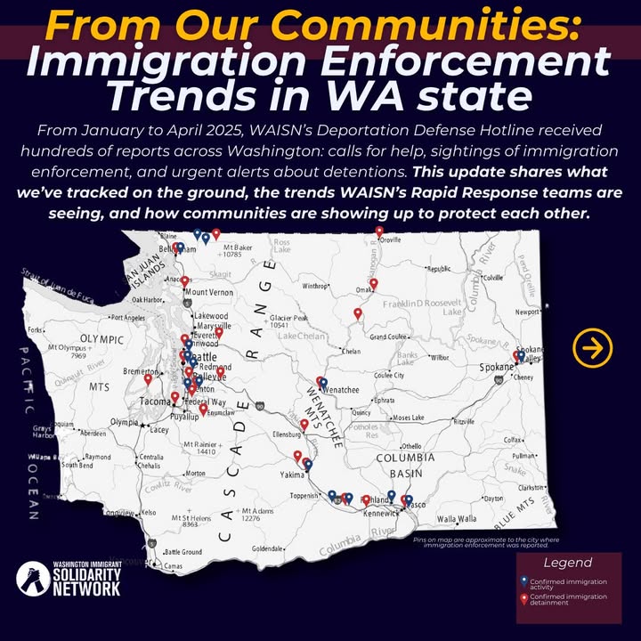 🚨 Immigration Enforcement Trends in Washington State: Jan–April 2025 🚨 Across Washington, our immigrant communities are being targeted, often in broad daylight, in everyday places, and without transparency. 🛑 103 individual detentions confirmed by WAISN 👁 51 WAISN Rapid Response team activations These numbers are not just statistics, they reflect stories of family separation, surveillance, and fear. But also of resistance, collective care, and community power. This update is part of our commitment to demystify immigration enforcement activity that is reported to the WAISN Deportation Defense Hotline, center the lived realities of those most impacted, and shine a light on the violent systems that criminalize forced migration. We aim to share updates like this every two weeks to keep our communities informed, prepared, and protected. Swipe through to learn what’s happening, how we verify information, and how you can take action. Slide 4 image credit: Washington Education Association Staff Organization #WAISN #KnowYourRights #DeportationDefense #CommunityCare (fb)