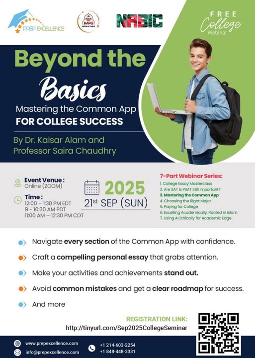 📢 Prep Excellence, MPG, and NABIC present a FREE college webinar: Beyond the Basics: Mastering the Common App for College Success_ 📅 Sunday, September 21st 🕒 12:00 – 1:30 PM EDT / 11:00 AM – 12:30 PM CDT / 9 - 10:30 AM PDT 📍 Venue: Online (Zoom) 🎤 Presenter(s): Dr. Kaisar Alam*, Renowned Educator Professor Saira Chaudhry*, Career Coach *An SAT top-scorer guest speaker 🎟 Registration Link: http://tinyurl.com/Sep2025CollegeSeminar (fb)