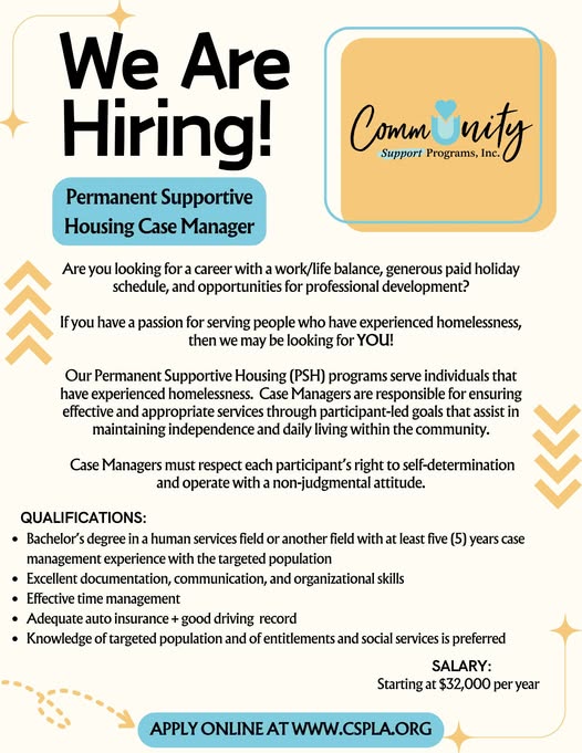 We are looking for one more Case Manager to help complete our Permanent Supportive Housing Team! Please share! Applications should be completed at www.cspla.org. (fb)