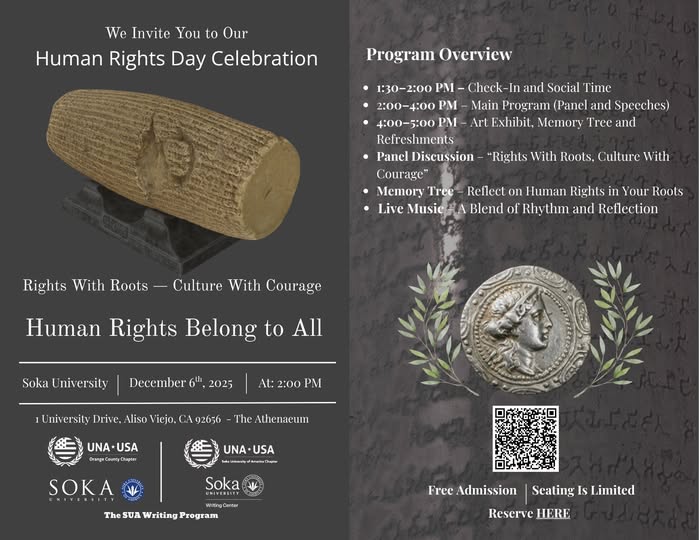 ✨ Rights With Roots — Culture With Courage ✨ Join Us at Soka University of America for Human Rights Day 2025! 📅 Dec 6 | 2–5 PM 🎓 Panel | 🎨 Art | 🎶 Music | 🤝 Community Explore how cultures past and present inspire the fight for human dignity. Free admission | Limited seating | Free parking Registration Link: bio #UNAOCCHonorsIntlDays #HumanRightsDay2025 #UNAOCC #SaraBalkhHRAmbassador #HumanRights #CultureWithCourage #RightsWithRoots (fb)