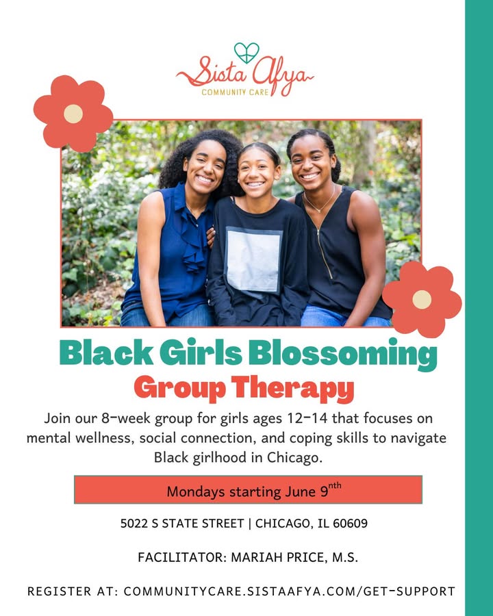 🌸LAST CALL! Black Girls Blossoming: Group Therapy for Teen Girls🌸 We have 2 slots left for Black Girls Blossoming! Sign your teen up today 😄 Join our 8-week group for girls ages 12-14 that focuses on mental wellness, social connection, and coping skills to navigate Black girlhood in Chicago. Utilizing the @blackgirlssmile , Group Coaching Curriculum, girls will experience a safe, empowering space to build their mental health literacy, foster a sense of belonging, and actively use tools and strategies to support their emotional well-being. Group begins on Mondays starting June 9th | Time 5:30 PM - 6:30 PM Location: 5022 S State Street, Chicago, IL 60609 Cost: FREE Sign your teen girl up for this transformative group at: www.communitycare.sistaafya.com/get-support (fb)