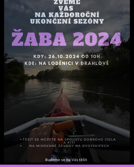 Jako každý rok, tak i letos pořádáme slavnostní ukončení sezóny! Přijďte s námi zavzpomínat na veškeré zážitky a vzpomínky z letošní sezóny💜 Tradiční žaba se bude konat 26.10. od 10 hodin na loděnici v Drahlově. Na programu také budou smíšené závody na dvojskifech a o dobré jídlo a pití bude postaráno!🍻🍗 Těšíme se na Vás!💜 (fb)