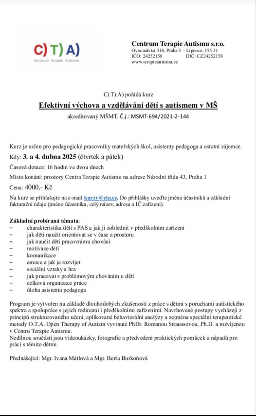 🌟Dvoudenní seminář pro pedagogy mateřských škol 🌟 Těšit se můžete na oblíbený kurz vedený speciálními pedagogy a odborníky v oblasti vzdelávání dětí s PAS v předškolním věku Mgr. Bertou Burkoňovou a Mgr. Ivou Mátlovou. Termín kurzu je 3. a 4. dubna. Hlaste se na kurzy@cta.cz Těšíme se na vás! (fb)