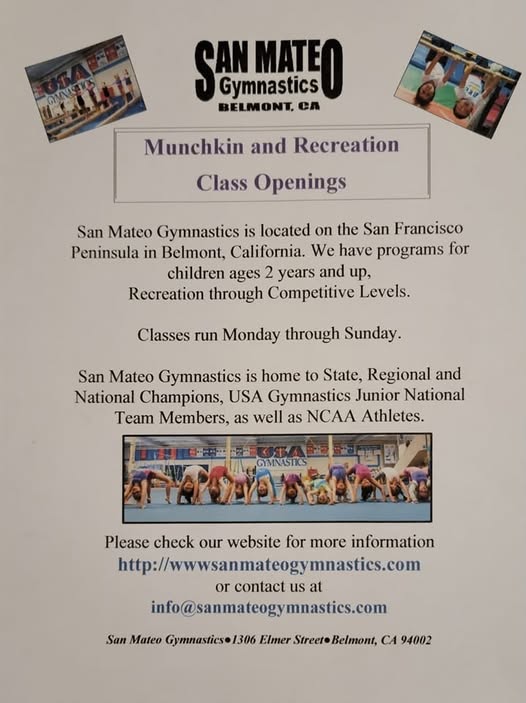Looking for a place for your children to learn to roll, jump, exercise, and have a good time?? Our instructors are eager to teach your children gymnastics in a safe, fun state of the art program.🤸🤸♀️🤸♂️🤸🤸♀️🤸♂️ Come join us for gymnastics classes, ages 2 years and up. Contact San Mateo Gymnastics at info@sanmateogymnastics.com for more information!! (fb)