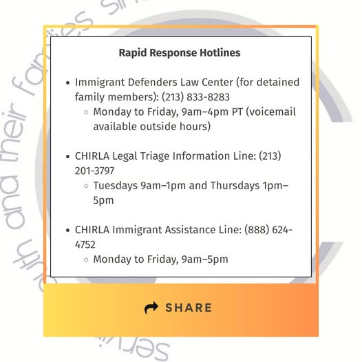 📣Community Update 📣 The Coalition for Humane Immigrant Rights (CHIRLA) has been essential in providing resources to families in Los Angeles amid the recent ICE raids. Please help us in sharing this list of hotline numbers created by CHIRLA. Visit chirla.org/resources/all-resources/ for more information. It is now more important than ever to support one another, avoid escalation, and know your rights. #Community #LosAngeles (fb)