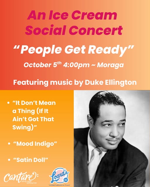 Only 2 weeks until Cantare's next concert "People Get Ready", featuring music by Duke Ellington! Following the concert, FREE ice cream will be provided by Loard's Ice Cream - Orinda for all attendees! Visit www.cantareconvivo.org/pgr to get your tickets today! . . People Get Ready October 5th, 4pm, Moraga Valley Presbyterian Church 10 Moraga Valley Lane . . Don't forget to like and share this post, and be sure to follow us for more concert updates and teasers! #youthchoir #concert #livemusic #oakland #moraga #orinda #icecream (fb)