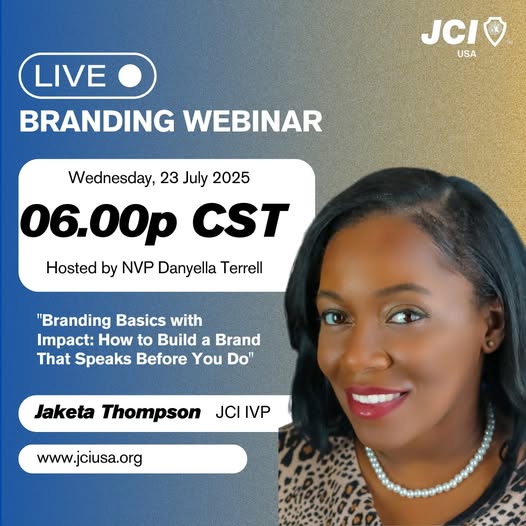 Ready to Make Your Brand Speak for You? Join us on July 23rd at 6 PM CST for "Branding Basics with Impact: How to Build a Brand That Speaks Before You Do" with JCI USA International Vice President Jaketa Thompson! In this dynamic session, you’ll learn how to craft a brand that reflects your values, grabs attention, and leaves a lasting impression — before you even say a word. 🖥️ Register now via Zoom: https://us06web.zoom.us/meeting/register/muJikmtCS7yFC6TumPGfqA Let your brand do the talking. Jaketa Clark Thompson holds several degrees and certifications, including a Certificate of Women’s Entrepreneurship from Cornell University, and owns two successful companies in the marketing and consulting industry. She currently lives in Virginia Beach with her husband, Chris, and four children where she serves on the City of Virginia Beach Minority Business Council. Clark Thompson joined the Virginia Beach Jaycees in 2017. She served as Local President in 2019 and 2020, Virginia State President in 2022, and National Vice President in 2023. At the international level, Jaketa served as JCI ADC Commissioner in 2024, and is currently a JCI Vice President assigned to America. She has been honored as JCI Senator No. 81561. #JCIUSA #BrandWithImpact #LeadershipDevelopment #JaketaThompson #PersonalBranding #EmpowerToImpact #JCIToolsToLead (fb)
