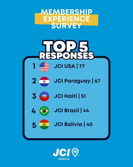 https://jci-go.link/2025YouthLeadershipSurvey These were the current top 5 countries in survey participation — but we've since fallen behind. Help us lead!!! The insights we gather from this survey will shape how we build the future of JCI: what we offer, how we grow, and how we lead. That’s why it’s so important to hear from both our members and the broader community. Every response helps us understand the real needs, aspirations, and opportunities for youth leadership in the Americas. 👉 Keep sharing the link — your voice matters. (fb)