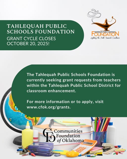 Teachers in Tahlequah Public Schools—grant applications are now open! The Tahlequah Public Schools Foundation is currently accepting requests for classroom enhancement projects. This is your chance to bring new resources, tools, and ideas to your students with support from the Foundation. Deadline to apply: October 20, 2025 The mission of the Tahlequah Public Schools Foundation is to encourage community support of education, secure contributions, and provide funding and equipment for the benefit of Tahlequah students. Learn more and apply here: cfok.org/grants (fb)