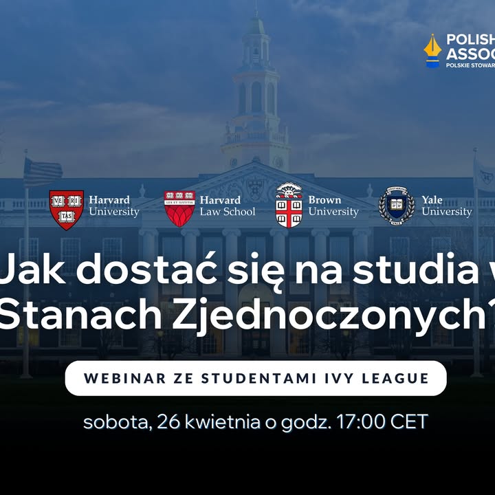 🚀 Marzysz o Harvardzie, Brown lub Yale? Twoja droga zaczyna się TUTAJ! 🎓 📅 Już 26 kwietnia o 17:00 (CET) dołącz do bezpłatnego webinaru Polskiego Stowarzyszenia Młodzieży i posłuchaj historii 4 studentów z Polski, którzy dostali się na uniwersytety Ivy League! 🔥 Dowiesz się: ✅ Jak stworzyć aplikację, która się wyróżnia, ✅ Jak pisać eseje, przygotować się do rozmów i zdobyć stypendium, ✅ Co naprawdę liczy się przy rekrutacji na topowe uczelnie w USA. 💬 Masz pytania? Po rejestracji możesz zadać je naszym prelegentom! 🎟️ Liczba miejsc ograniczona — zarejestruj się już teraz. Dołącz do nas i zrób pierwszy krok w stronę realizacji swoich akademickich marzeń! 🌍📚 _______ 🚀 Dreaming of Harvard, Brown or Yale? Your journey starts HERE! 🎓✨ 📅On April 26 at 11:00 AM EST, join the Polish Youth Association’s FREE Ivy League Webinar and hear directly from 4 students from Poland who made it to Harvard and Brown University! 🔥 They’ll reveal: ✅ How to build a standout application, ✅ Insider tips for essays, interviews & financial aid, ✅ What it really takes to get into top U.S. universities. 💬 PLUS: You can submit your own questions to the speakers when you register! 🎟️ Spots are limited — register NOW through the link. Don’t just dream it. Learn how to achieve it. 🌍📚 (fb)