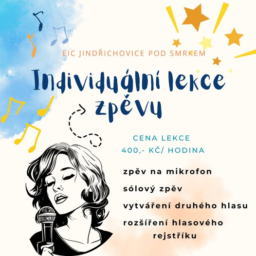 N O V Ý K U R Z 🎤 Individuální lekce zpěvu s Karlou Salabovou! 🎤 Chcete se naučit zpívat, rozšířit svůj hlasový rozsah nebo se zdokonalit ve zpěvu na mikrofon? Pak právě pro vás je tu novinka v EIC Jindřichovice pod Smrkem – individuální lekce zpěvu pod vedením Karly Salabové, písničkářky, textařky a zpěvačky - vystupující pod jménem KAYA! Karla Salabová má za sebou bohatou hudební kariéru, během níž vydala tři sólová alba a aktivně koncertuje. Díky svým zkušenostem vám dokáže předat cenné tipy a techniky zpěvu, a to zábavnou a praktickou formou, aby si každý z lekce odnesl co nejvíce. 🎶 Co vás čeká? Zpěv na mikrofon Sólový zpěv Vytváření druhého hlasu Rozšíření hlasového rejstříku 💸 Cena lekce: 400 Kč/hodina 📅 Termíny lekcí: Individuálně po domluvě Přijďte objevit radost ze zpěvu, zlepšit své dovednosti a nechat se inspirovat jedinečným stylem a přístupem Karla Salabové! 🎵 👉 Rezervujte si svou lekci ještě dnes! Pro více informací a rezervace nám napište zprávu nebo nás kontaktujte na našem webu. Těšíme se na vás! (fb)