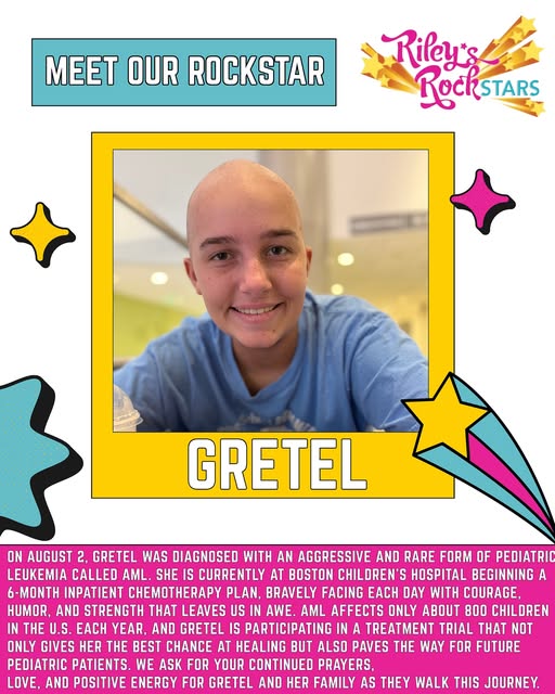 💛 Meet Gretel, a true Rockstar! 💛 On August 2, Gretel was diagnosed with an aggressive and rare form of pediatric leukemia called AML. She is currently at Boston Children’s Hospital, bravely beginning a 6-month inpatient chemotherapy plan. Each day, Gretel inspires us all with her courage, humor, and strength. 🎗️ Let’s surround Gretel and her family with prayers, love, and positive energy as they continue this journey. 💕 #RileysRockstars #ChildhoodCancerAwareness #NoChildFightsAlone #teamgretel (fb)